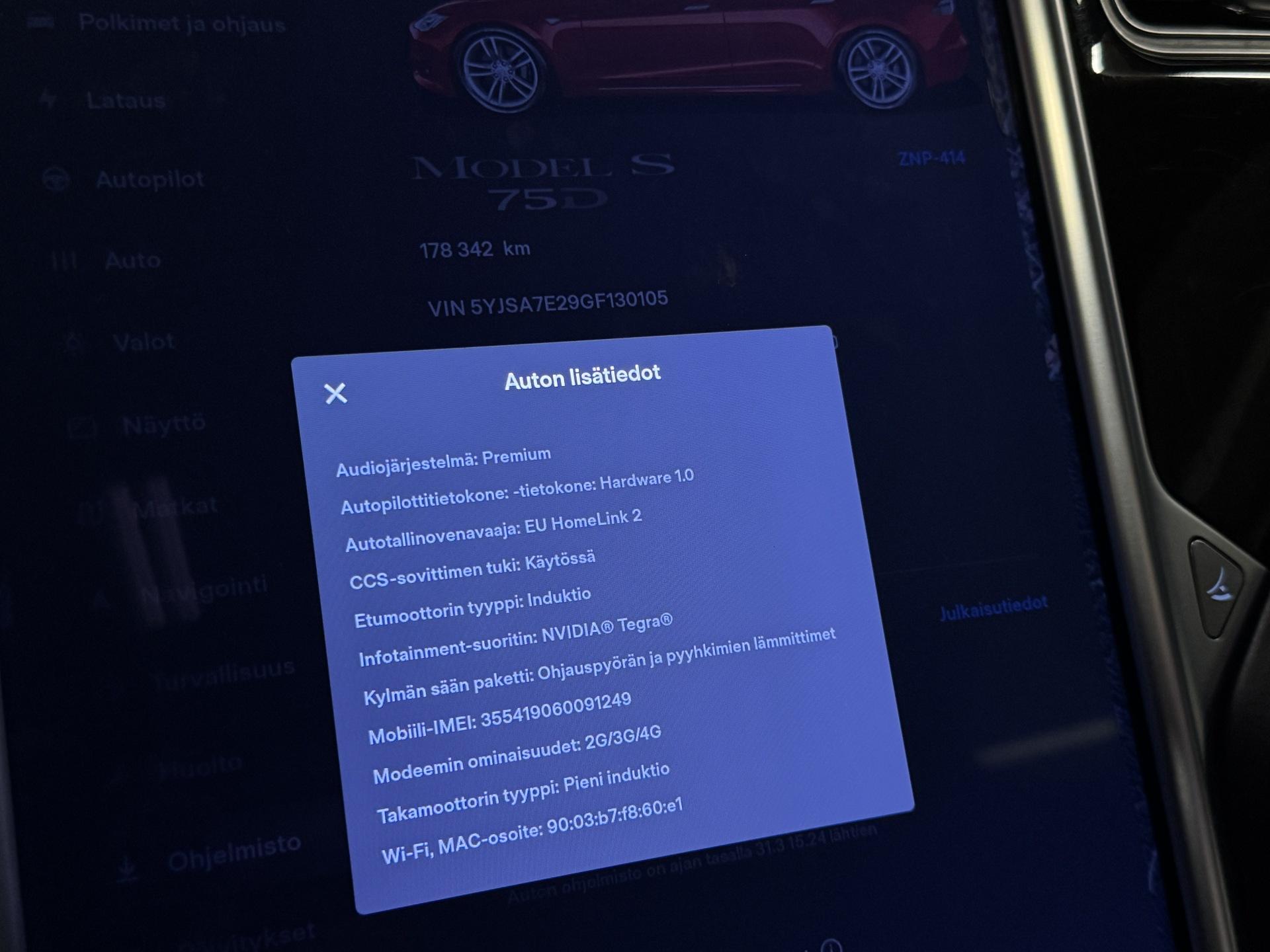 Hyödynnä ainutlaatuinen BL4CK WEEK -kampanja ja päivitä autosi poikkeuksellisen edullisin ehdoin. Tarjoamme nyt kokonaisuuden, jossa rahoitus, vakuutusedut ja maksujoustot tekevät auton hankinnasta helpompaa kuin koskaan. Edullinen rahoitus: Saat auton käyttöösi jopa 1,99 % rahoituskorolla + kulut (Rahoituskorko sidottu Euribor 1 kk -viitekorkoon + 0,1 % marginaali) Maksamisen joustoa: Osta auto nyt ja aloita maksaminen vasta myöhemmin saat jopa 3 kuukautta maksuvapaata, jolloin ensimmäinen erä voi siirtyä juhannuksen jälkeiseen aikaan. Turvaa edullisemmin: Kasko nyt -20 % ensimmäiseksi vuodeksi, jotta ajaminen on huolettomampaa heti alusta alkaen. Lisäedut ja tärkeää tietoa: Kampanja on voimassa rajoitetun ajan joten nyt on oikea hetki toimia! 1,99 % rahoituskorko koskee enintään 40 000 € rahoitusosuutta Yli 40 000 € rahoituksissa korko 2,99 % + kulut Lähes kaikkiin autoihin saatavilla laaja lisäturva jopa 3 vuodeksi Lisäturvan voi kätevästi sisällyttää kuukausierään Lisätietoa lisäturvasta: https://fragus.com/fi/tuotteemme-ja-palvelum ... Lisäturvan hinnasto: https://autolahde.fi/lisaturva/Näyttävä Tesla Model S hyvällä akkutestituloksella! Akkutakuu voimassa 2v/60tkm ostohetkestä. Ostettavissa myös kolmanneksi vuodeksi (499€). Akkutestin tulos: 90,4%!Kahdet renkaat alumiinivantein, Moottoritien autopilot, Adaptiivinen vakionopeudensäädin, Lämmitys jokaisella istuimella, Lämmitettävä ohjauspyörä, Lämmitettävät tuulilasinpyyhkijät, Premium-audiojärjestelmä, Premium connectivity, Sähköisesti avattava lasikattoluukku, Sähkösäätöiset nahkaistuimet kuljettajan muisteilla, CCS-retrofit, Summon, Sähkötoiminen takaluukku, Yms!Kysy tähän autoon edullinen vaihto- tai rahoitustarjous!